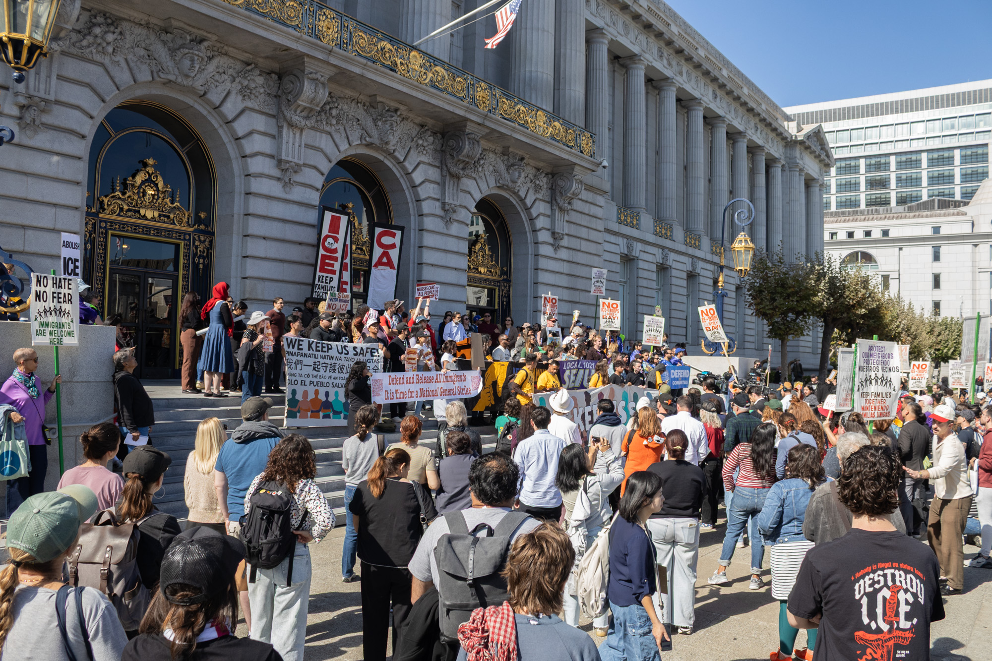 Hours after the Trump administration walked back plans for a federal “surge” in San Francisco, more than 200 people rallied on the steps of City Hall, demanding federal agents stay out of the Bay Area.