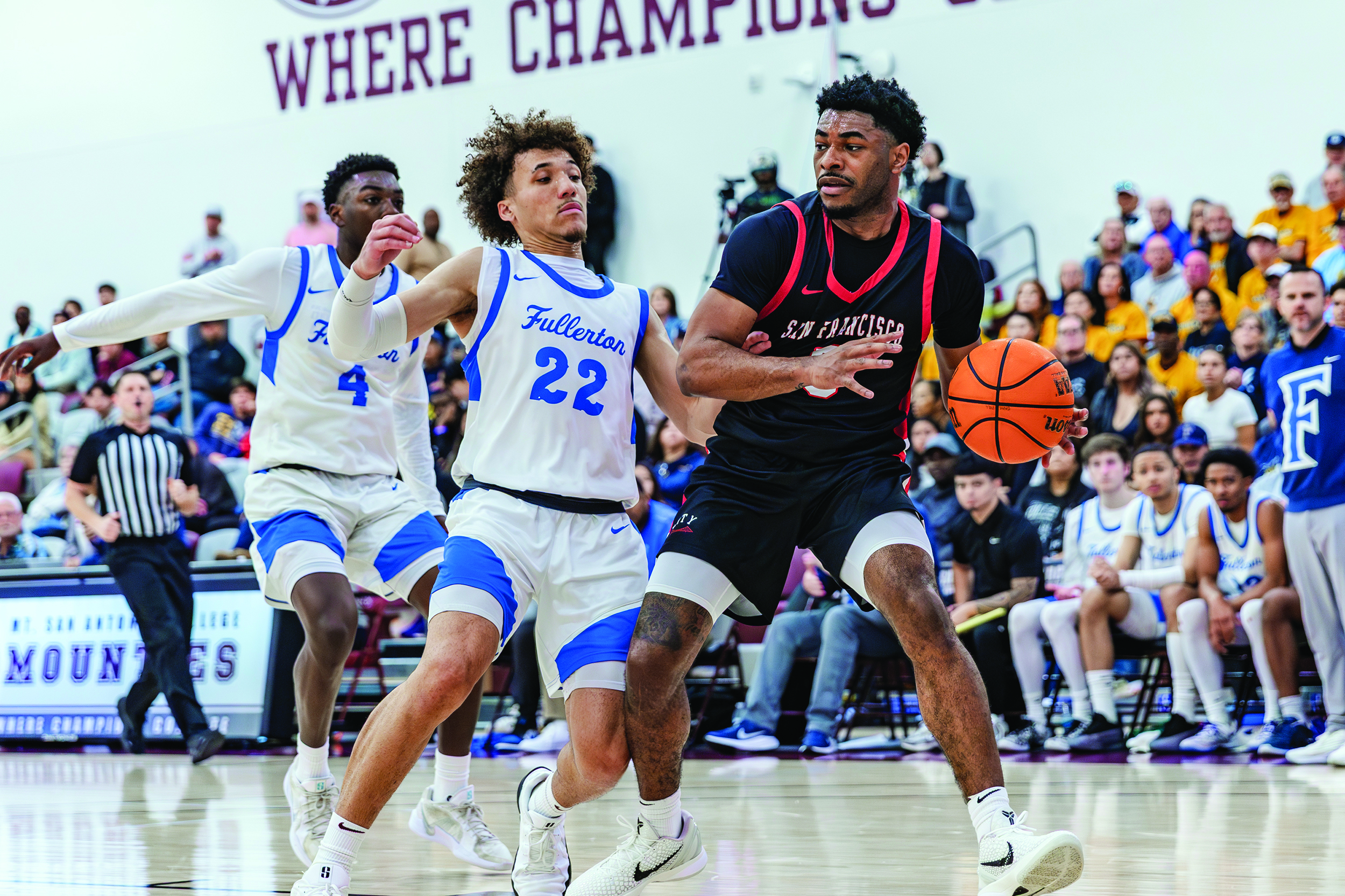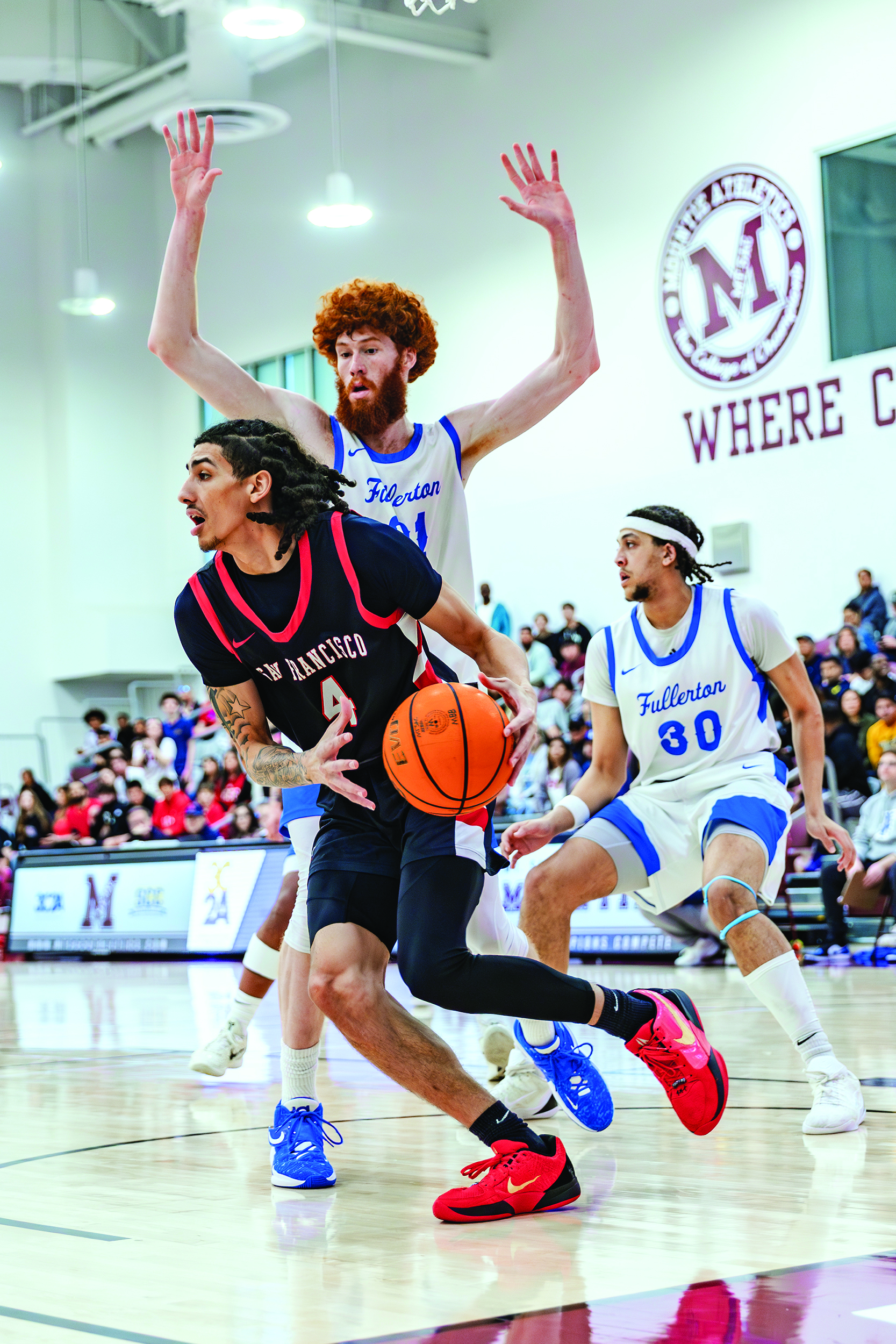 The Rams opened the championship game with suffocating defense, their signature full-court press forcing Fullerton into rushed shots and costly mistakes. By halftime, San Francisco had built a 32-23 lead, their defense holding Fullerton to just 34% shooting in the first half.