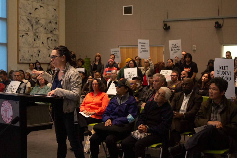 The crowded room overflowed with impassioned community members and signs that read “Students Need More Classes!” and “Meet Student Demand!”