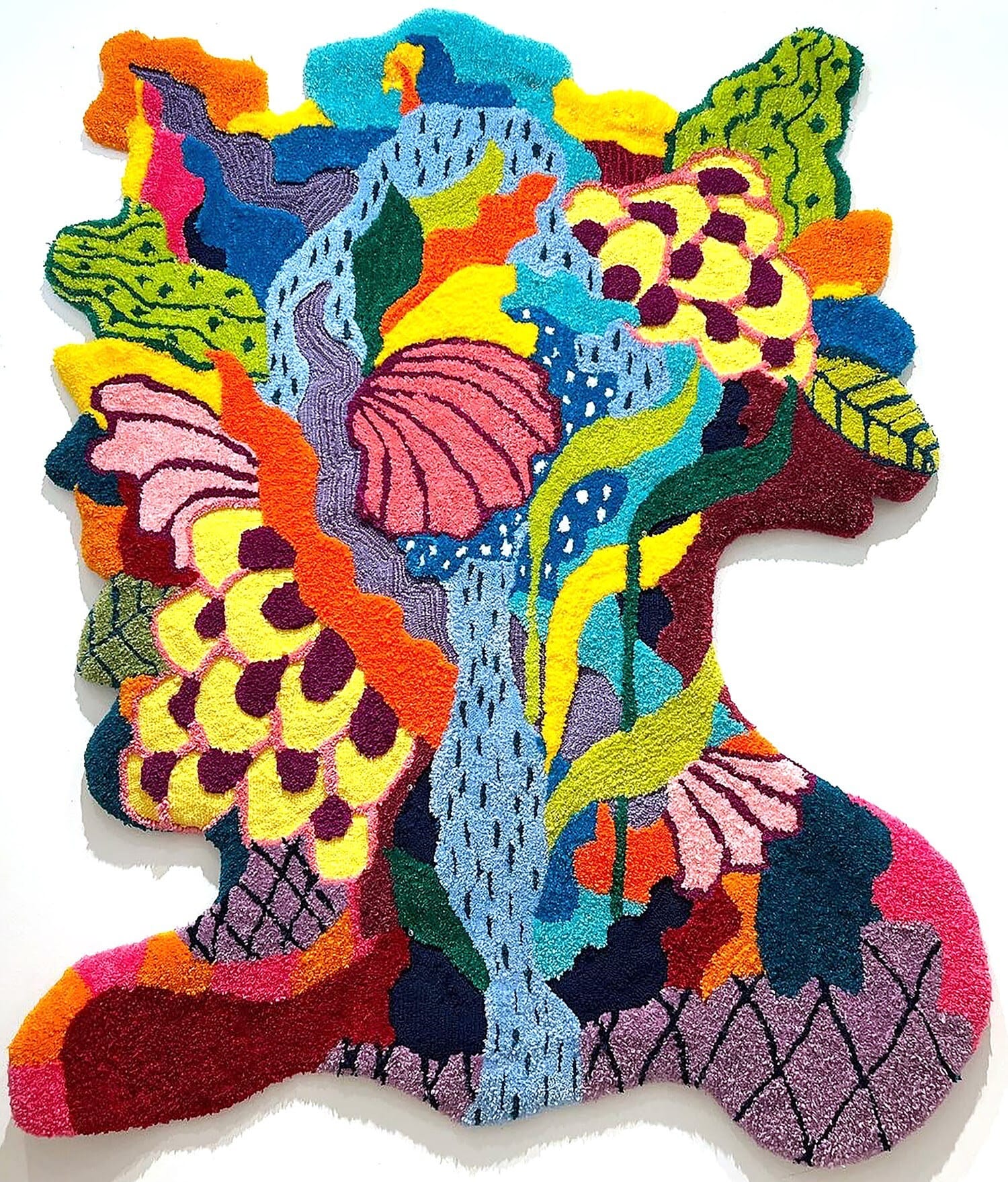 Formally trained as a painter, Banzaca began experimenting with tufting during the pandemic after seeing videos of the technique on social media. “When I tried it, I became intrigued by the way I could paint with the yarn, and it really broke me out of the format of a canvas, square, or rectangle,” she recalled.
