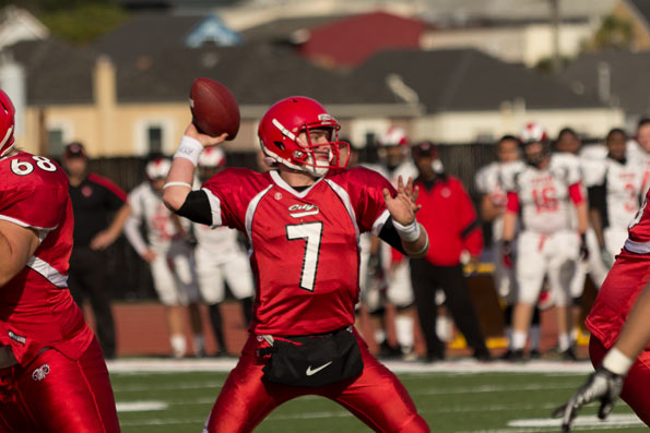 Ram’s Quarterback Turner Baty #7 winds up to deliver a 1st quarter touchdown during a game against Fresno in the NorCal Championships on Nov. 26, 2011. Baty threw for 364 yards and 7 touchdown passes. ALISA MARIE OROZCO / THE GUARDSMAN