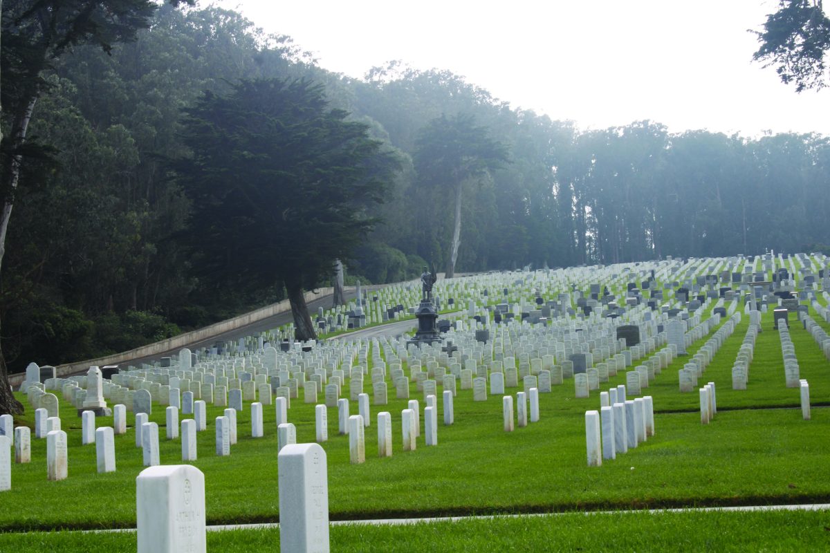 Across the city, memory takes a different shape. The San Francisco National Cemetery, at the northern edge of the Presidio, slopes toward the bay in precise rows of stones.