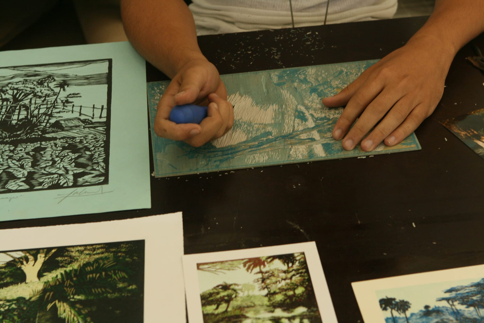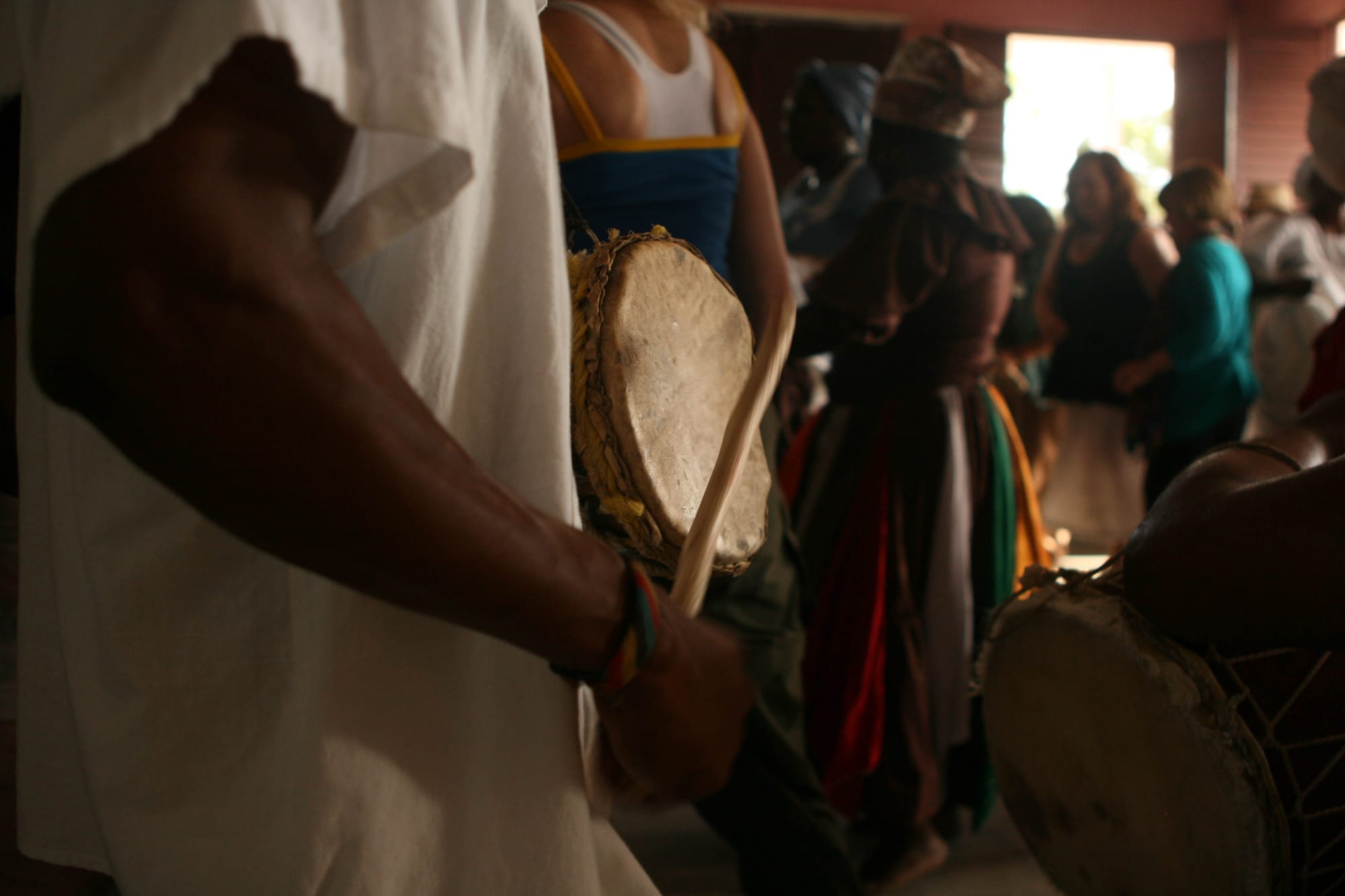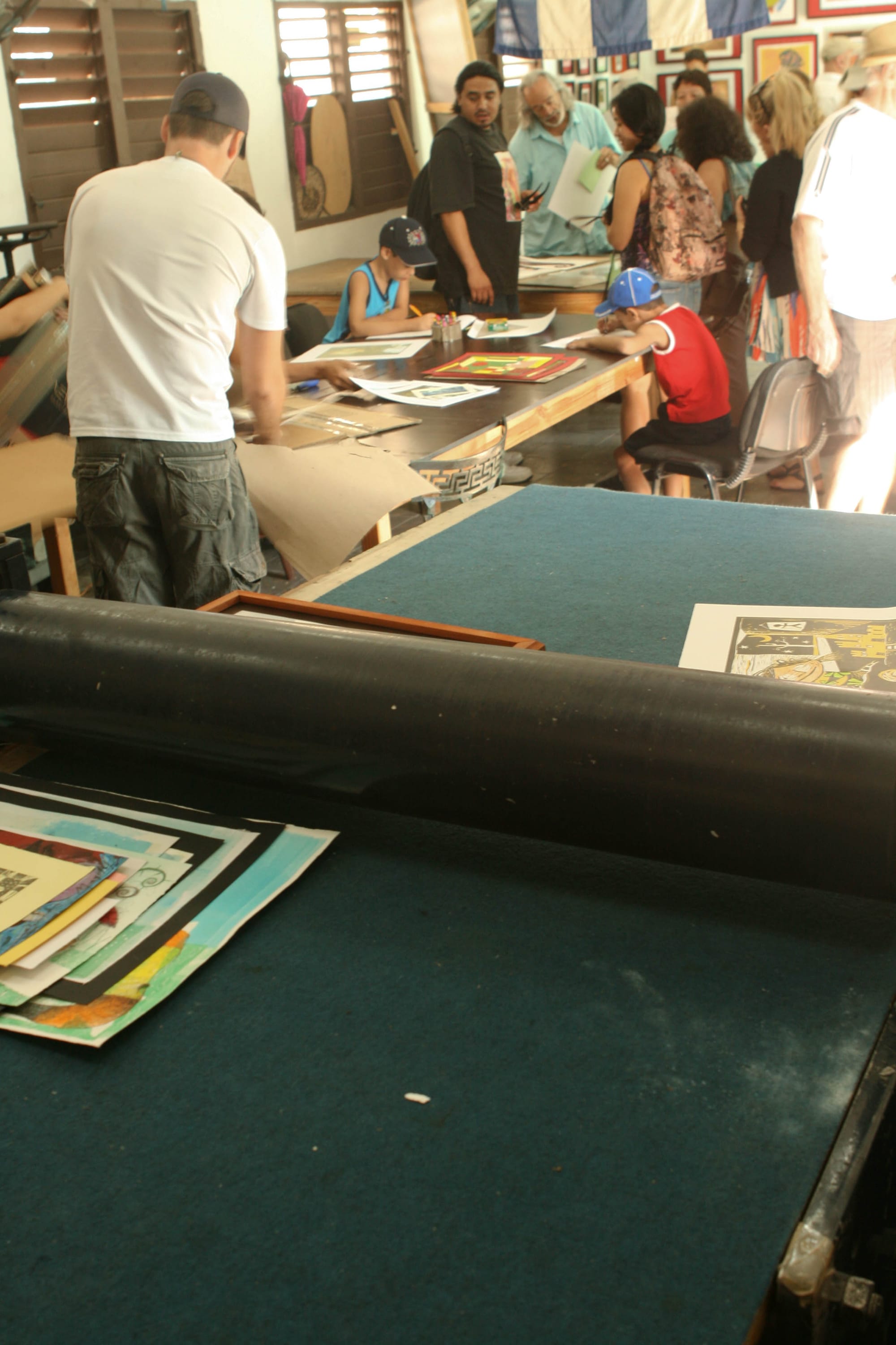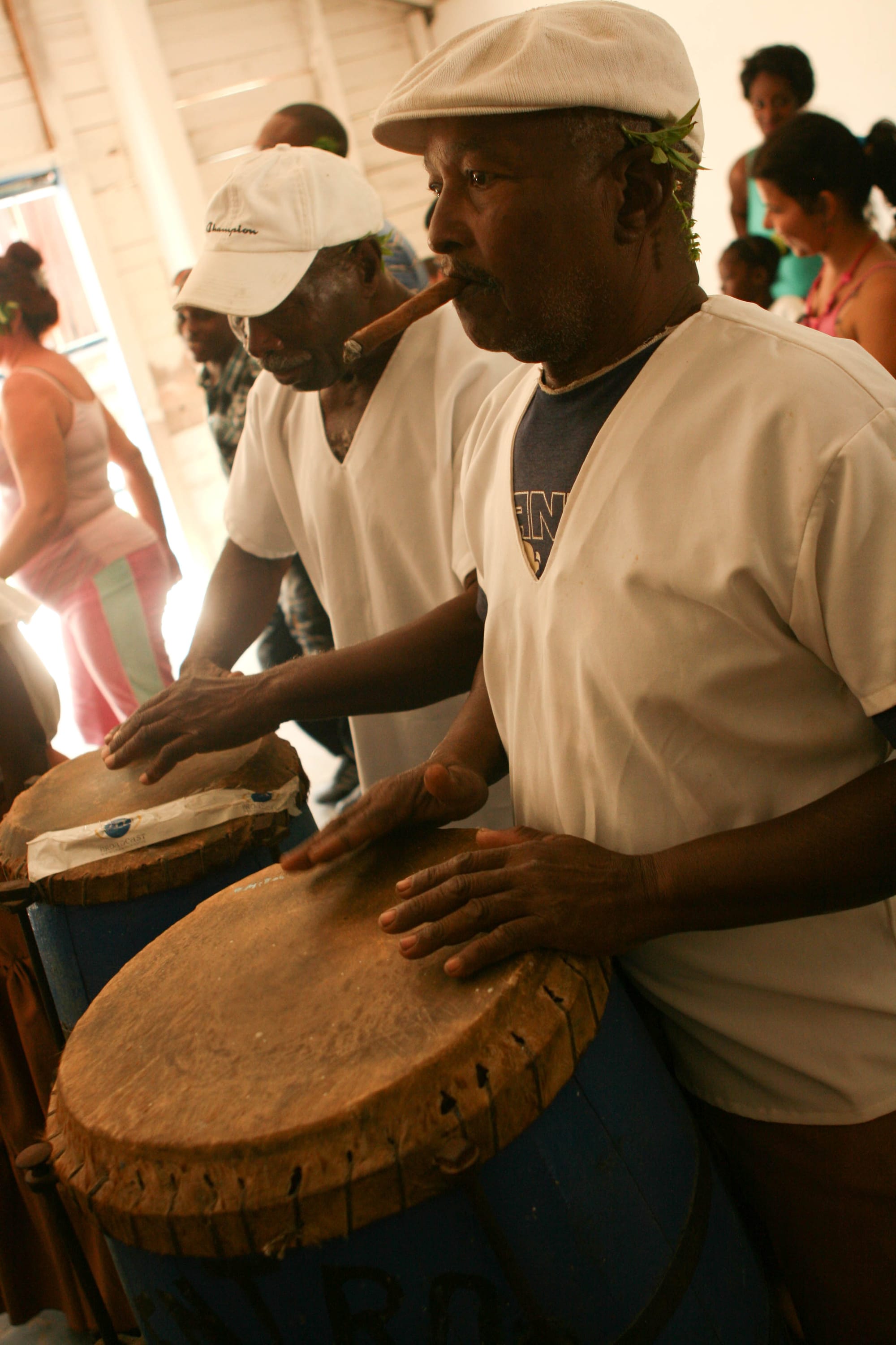 An artist at the Sociedad Grafica de Cienfuegos works on a linoleum cut for printmaking. Education in Cuba is free and accessible to all, with a general stipulation that upon completing their degrees, students will go on a several year mission to give back to society. Cienfuegos, Cuba. January 5th, 2013 (Photo by Matt Lambert)A bicycle taxi driver waits for a fare in the central plaza of Havana. Despite the easy access to education, the most lucrative careers are those that put workers in contact with tourist CUCs. With high end salaries paying only around $30 a month, many find extra work to supplement their ration cards. Havana, Cuba. January 7th, 2013 (Photo by Matt Lambert)Students from City College of San Francisco tour the printshop of the Sociedad Grafica de Cienfuegos. The mission of ths printshop is to provide activities and support for children with Down's Syndrome. Cienfuegos, Cuba. January 5th, 2013 (Photo by Matt Lambert)The only billboards present on the island of Cuba are slogans referencing the revolution, such as this, seen on a wall in Cienfuegos, Cuba. Cienfuegos, Cuba. January 5th, 2013 (Photo by Matt Lambert)A pre-1959 Ford parked on the street outside the Sociedad Grafica de Cienfuegos. Following the Revolution in Cuba, the United States cut off all trade with the island. Mechanics have lovingly kept the island's large fleet of such cars running mostly on ingenuity, skill, and a prayer. New parts are virtually impossible to obtain. Cienfuegos, Cuba. January 5th, 2013 (Photo by Matt Lambert)A devotee with the Hijos de Santa Barbara dances in the role of Ochun. Ochun is the master of feminity and love. She is one of the primary characters in the Yoruba pantheon, as the partner of Chango, who is represented in the Catholic Saint Barbara. Palmira, Cuba. January 4th, 2013 (Photo by Matt Lambert)A drummer with Hijos de Santa Barbara plays at a ceremony attended by students of City College of San Francisco. These ceremonies are a blend of Yoruba traditions and Catholic traditions, a blend used in part to disguise the African roots of these ceremonies from the slavemasters. Palmira, Cuba. January 4th, 2013 (Photo by Matt Lambert)Drummers at the Casino Congo play congos during a Palo Monte ceremony in Lajas, Cuba. Lajas, Cuba. January 4th, 2013 (Photo by Matt Lambert)