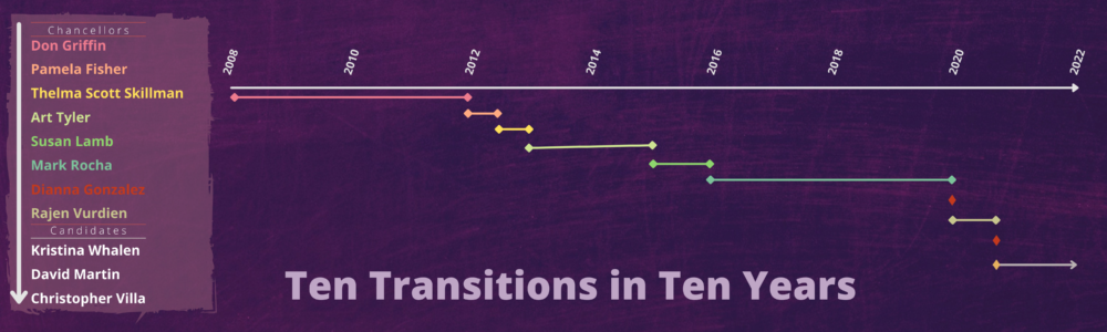 Don Griffin, Pamela Fisher, Thelma Scott Skillman, Art Tyler, Susan Lamb, Mark Rocha, Deputy Chancellor Dianna Gonzalez and Rajen Vurdien all served for a few months to a couple years. Gonzalez, who presently serves as interim chancellor, has served in the role for two stints.