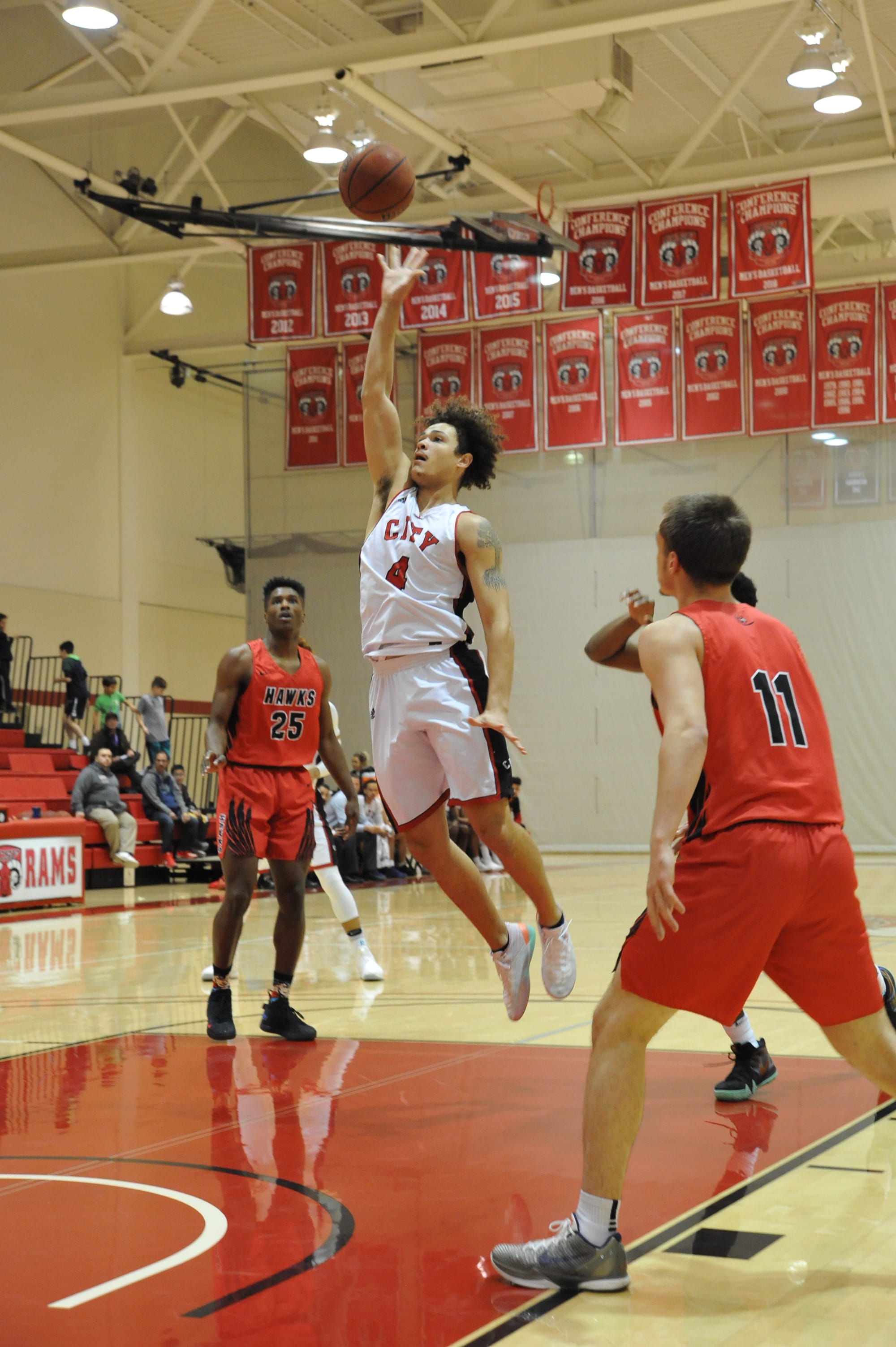 Much like City College’s women's Rams, the men’s team had a great passing game. Most of the starters scored points early in the game starting with 6”7’ freshman Walter Urbina striking first, for two points. Sophomore Austin McCullough followed up by scoring a three from beyond the arch.