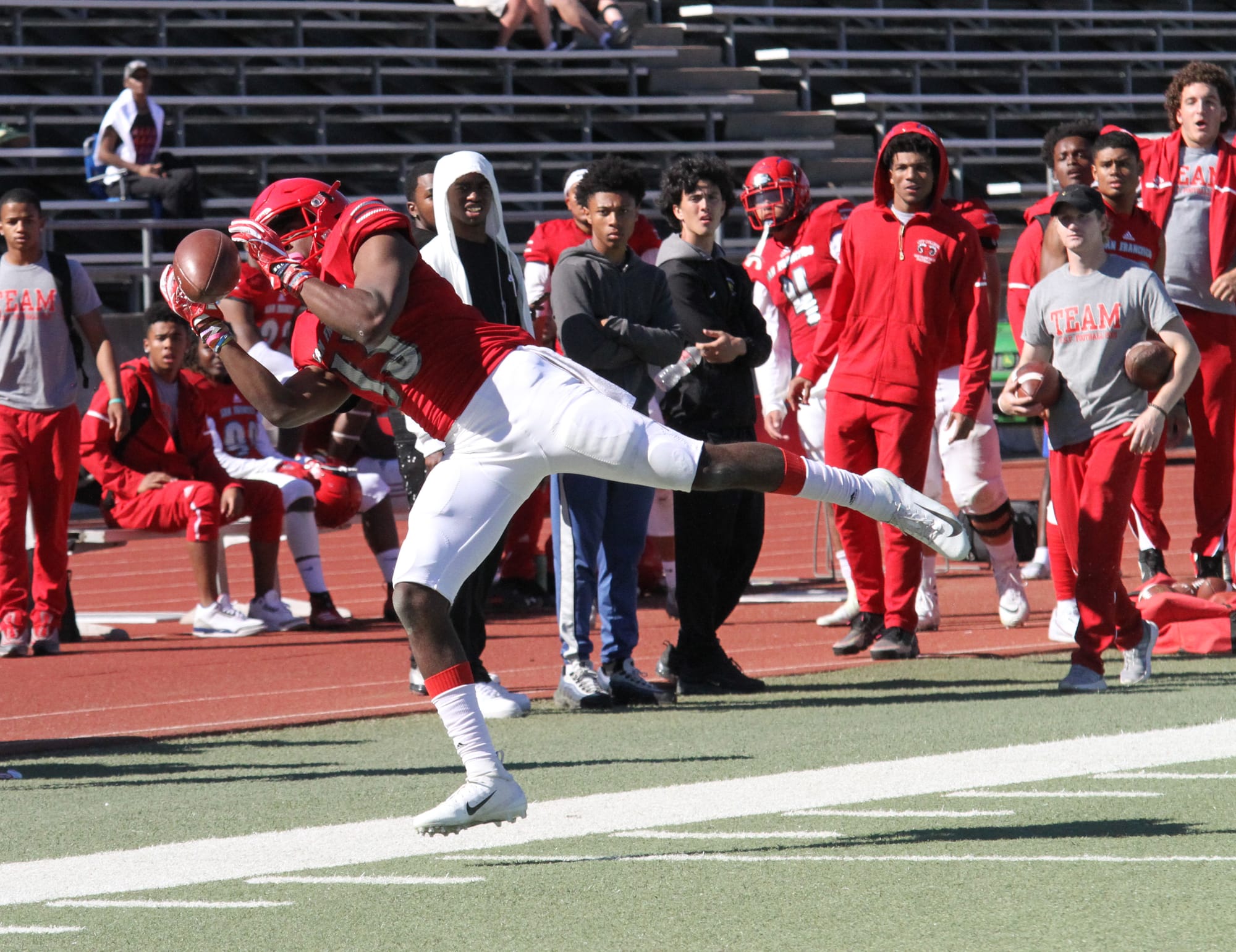 Starting quarterback Ethan Bullock, from Orlando, Florida, scored on a quarterback keeper in the first quarter, then proceeded to spread the love. He threw touchdown passes to three different wide receivers: Sophomore Christian Willis, from Sandy Springs, Maryland, Freshman Ezra Grace, from Honolulu, Hawaii, and Sophomore Kenden Robinson Jr. from Encinal High School in Alameda, who scored twice.