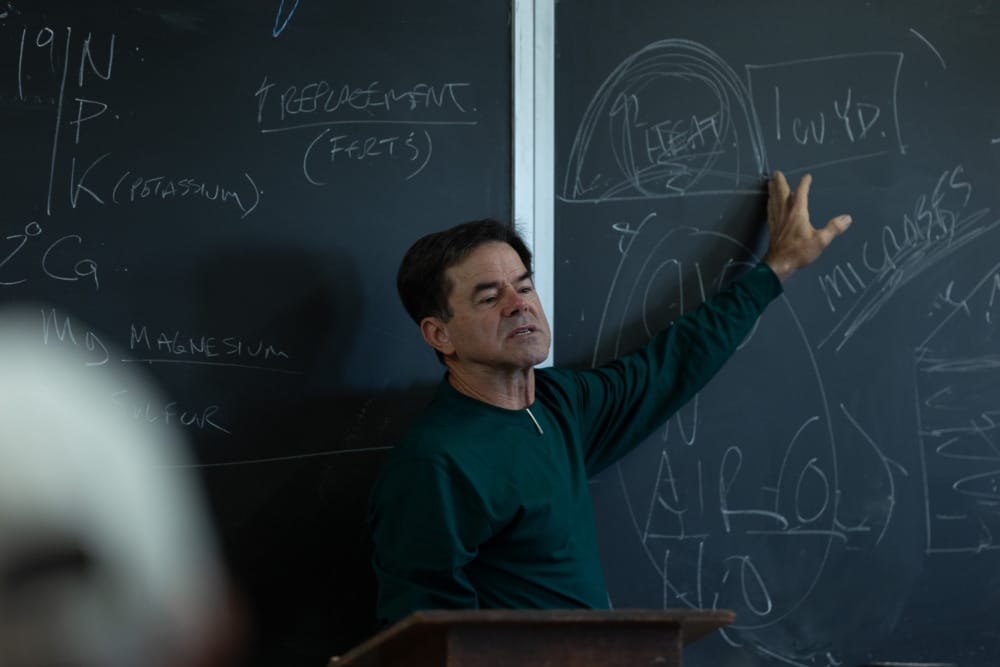 This Saturday morning he is preparing his introductory Horticulture 50 class to repot and eventually transfer seedlings into the garden. Sitting on the edge of his desk, enthusiastically poking holes in the air, he describes nature’s circular process of enriching soil, and human efforts to quicken the process with hot composting.