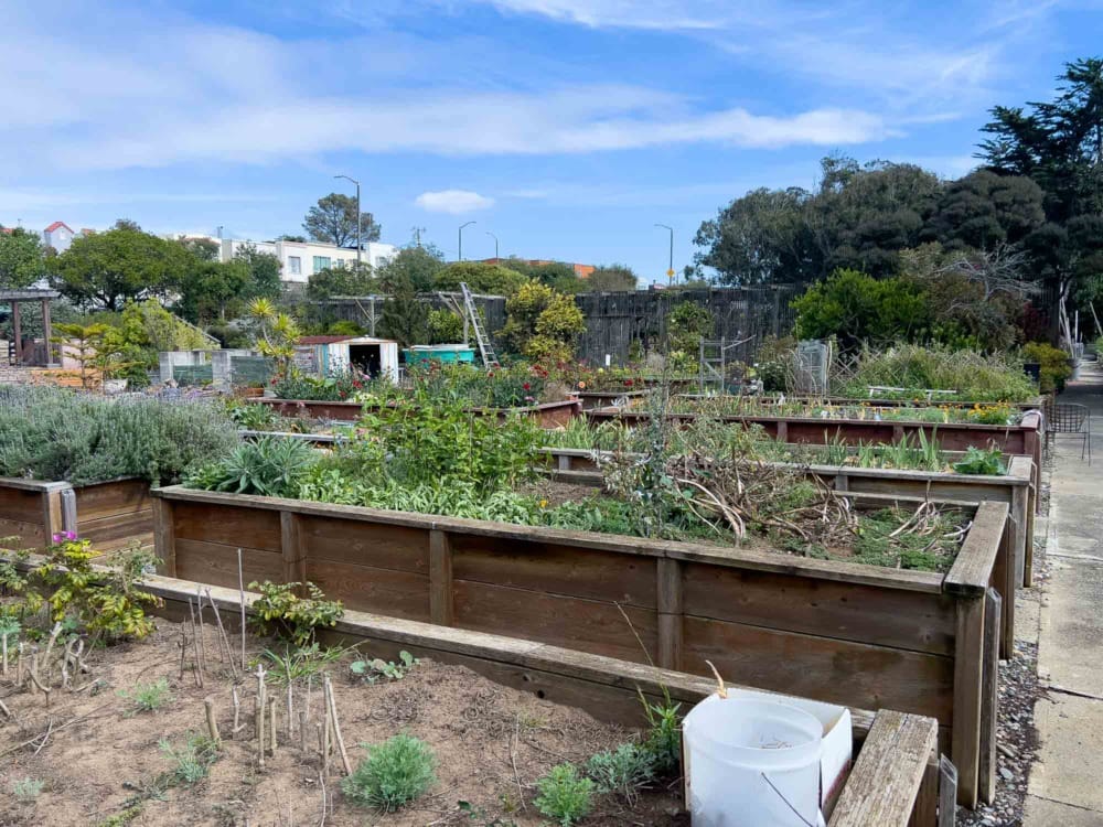 Hillan gathers the class and leads them briskly out of the classroom into the cool October mist beginning to dissipate under a brightening sky. On the other side of an asphalt parking lot, more than 50 raised wooden planters, some as large as 8 by 40 feet, others much smaller, display some of the plantings students care for. In one bed several thorny vines look naked except for a single white rose clinging to its last petals for the season, while another bed is inexplicably full of red, white, pink and orange flowers atop green foliage.