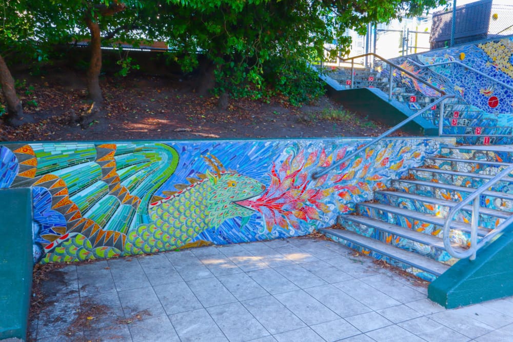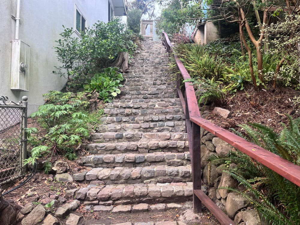 To make the walk in the park a little longer there are some noteworthy staircases in the neighborhood such as the Dragon Tale and Bengal Alley staircases. The Dragon Tale staircase is a mosaic staircase located off Bella Vista Way and goes up to the back entrance of Miraloma Elementary School. The same designers who designed the Instagrammy 16th Avenue Tiled staircase also did this one, so it has a similar artistic look. The tiles on the stairs depict different leaves and shrubs with the Dragon’s Tale and the side of the staircase on the wall has a colorful mosaic of the dragon breathing fire. The Bengal Staircase called Bengal Alley on the east side of the park on Miraloma Drive are a zig zag pattern going around planter beds then ascending an old cobblestoned stretch of stairs. Altogether it’s around 113 stairs which brings you from Miraloma to Lansdale Ave.