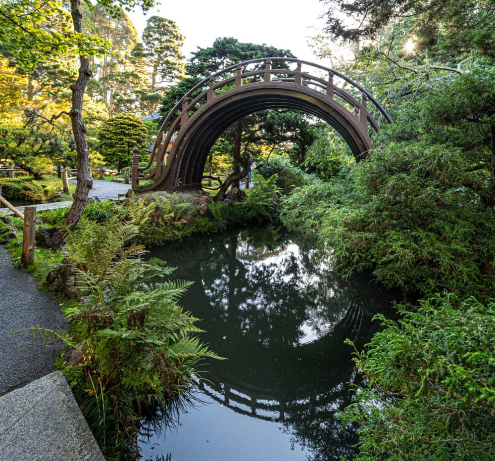 The Tea House was also built for the fair. It has been rebuilt over the years to its current rendition. Today the house offers snacks and several kinds of tea to enjoy overlooking tranquil gardens and koi ponds. One of the more popular snacks, the fortune cookie, was introduced to the U.S. here at the Tea House around 1900. Photo by Bob Kinoshita/The Guardsman.The bridge was originally built in Japan and shipped here for the 1894 Fair. The name Drum Bridge is derived from its shape; when reflected on the water, its full circle shape resembles a drum. The design of the bridge has 3 main functions, to slow people down, to let boats sail under and its namesake, to enjoy the water reflection of a drum. Photo by Bob Kinoshita/The Guardsman.
