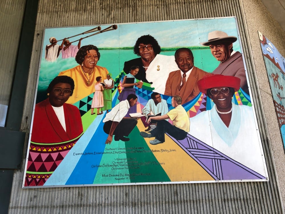 In the 1970’s, following passage of the federal Clean Water Act, the city undertook a major expansion of the wastewater treatment plant located in the historically black neighborhood. Powerful community protests won a mitigation agreement that led to the construction of the South East Community Center on Oakdale, adjacent to the plant. A mural beside the entrance celebrates the community leaders who led the fight.