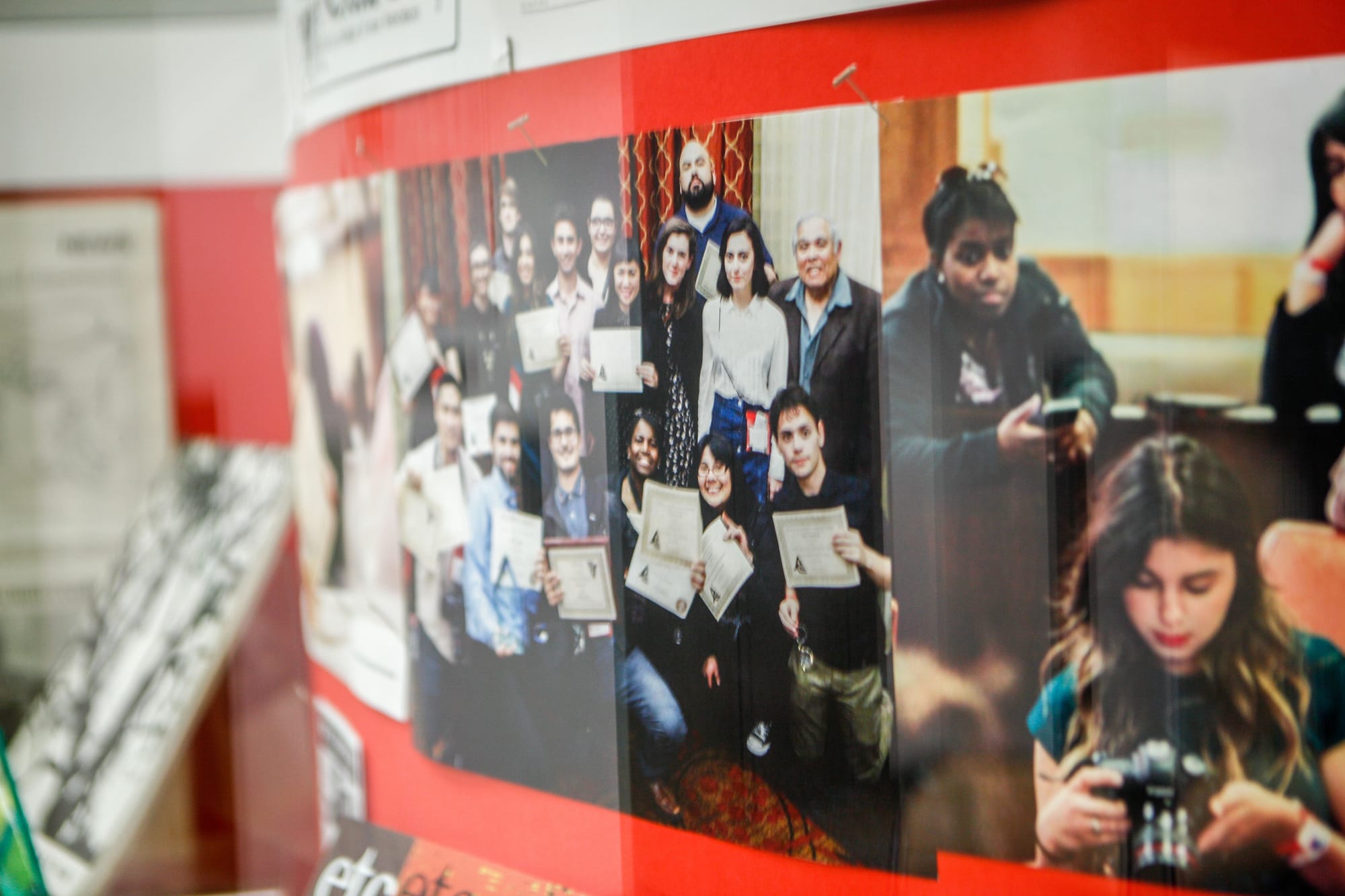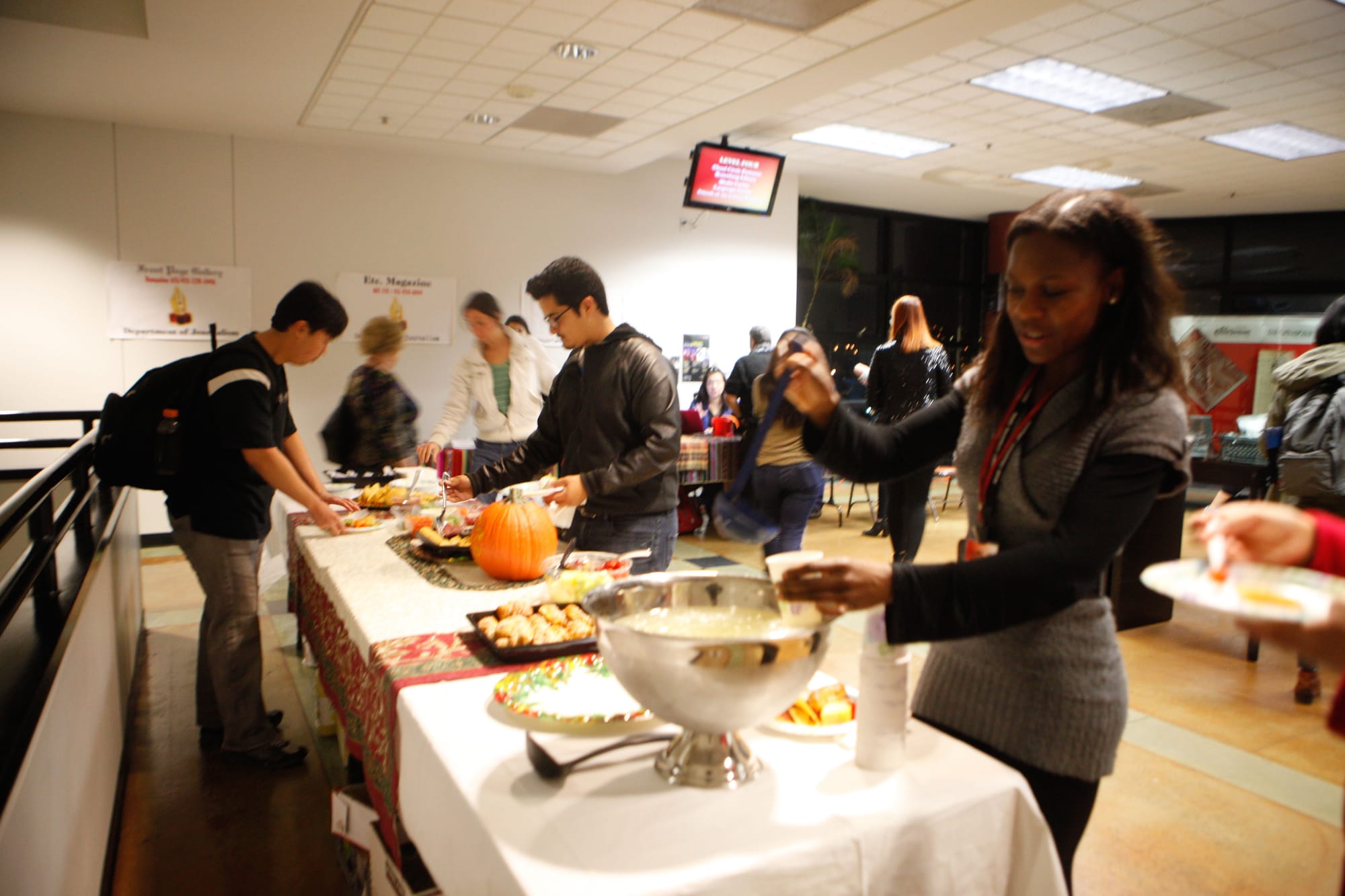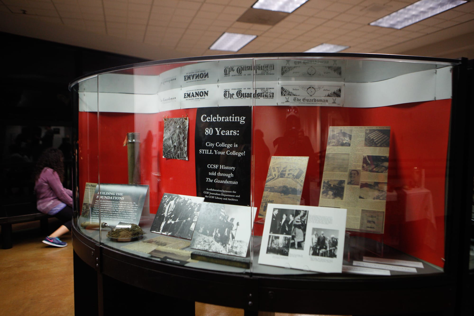 Attendees of the 80th Anniversary celebration of City College’s newspaper, The Guardsman, view photos and historical information on display in the Louise & Claude Rosenberg, Jr. Library on Thursday, Nov. 12. (Photo by Franchon Smith/The Guardsman)