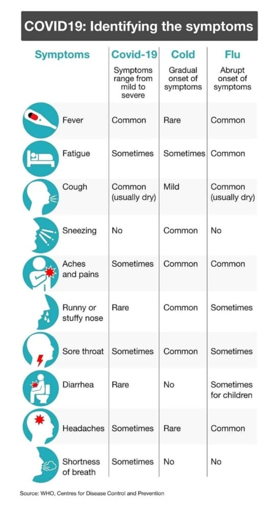 A symptom chart of coronavirus can be found with help from the World Health Organization. As COVID has similarities with the cold and flu, students and faculty should continue to test themselves and quarantine if feeling unwell.
