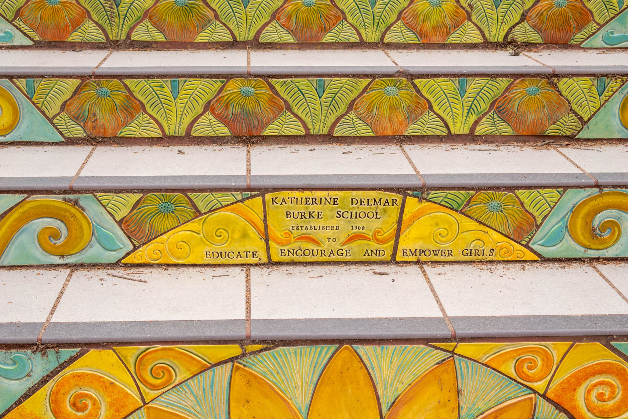 The idea to revamp the staircase came from The Friends of Lincoln Park, a group founded by Anna Yatroussis and Meg Autry. Working with the school to brainstorm a project for their 100-year anniversary, they wanted to give back to the community. Yatroussis, an alumna and parent at Burke’s, worried the worn stairs had become unsafe and an eyesore. An art project was decided on to make the stairs more appealing. With community support and fiscal sponsorship from the San Francisco Parks Alliance, the new stairs began to take shape.
