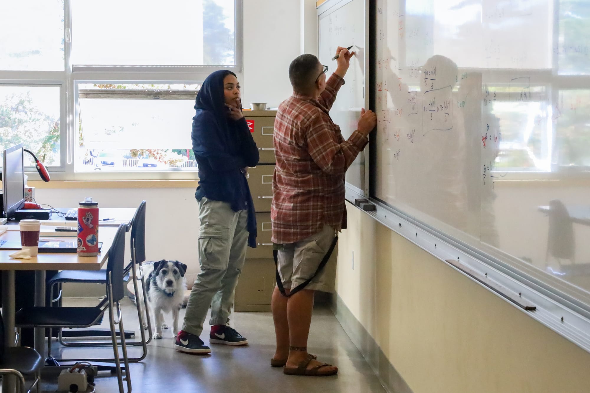 In a busy classroom at City College’s Ocean campus, Mary Bravewoman stands at the front with a whiteboard full of equations behind her. She speaks energetically, explaining details of Pre-Calculus and Trigonometry, using big gestures to show important concepts. At her feet, Dolly, her faithful canine companion, rests, occasionally raising her head to look around the room.