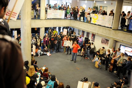 The demonstrations started at SF State, where some 500 students and faculty gathered in the Cesar Chavez Student Center to listen to speeches, spoken word and songs about budget cuts.