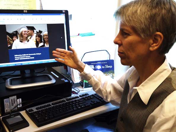 Karen Saginor, Academic Senate President, speaks with Guardsman reporter about issues on recommendations by California Community Colleges Student Success Task Force, on Oct. 26, 2011. KATHERINE GELARDI / THE GUARDSMAN The City College Board of Trustees rejected the draft report from the Student Success Task Force, who aim to financially support academically successful students at the expense of those in need.