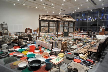 To release the emotions stored in the household objects, Song and his mother sorted and arranged over 10,000 collected pieces – toothpaste tubes, shoes, combs, crayons and bric-a-brac – that carpet the YBCA main gallery.