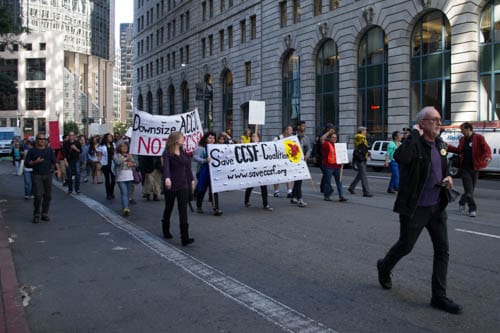 People held signs that said “Save City College” and chanted “They say cut back, we say fight back” as the crowd of about 400 marched down Market Street from City College’s Downtown center to the Department of Education on Beale Street.
