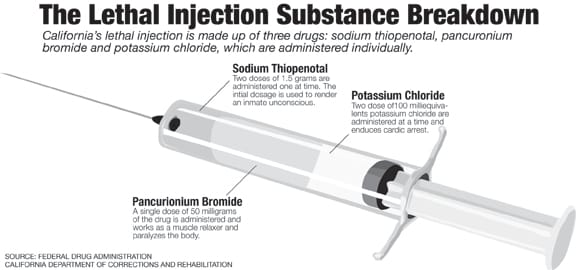 Sodium thiopental, a barbiturate responsible for the absence of pain during execution, is one of three drugs ensuring the lethal injection process in California to be humane. It is administered in two doses of 1.5 grams each and a back up injection of 2.5 grams. If the the drug is not refrigerated properly, problems could arise.