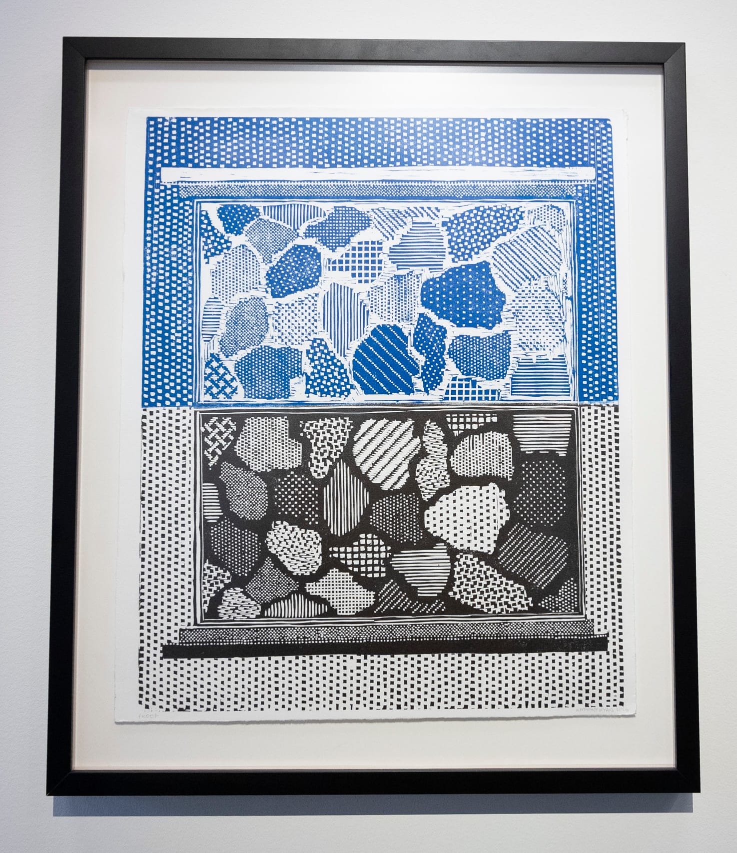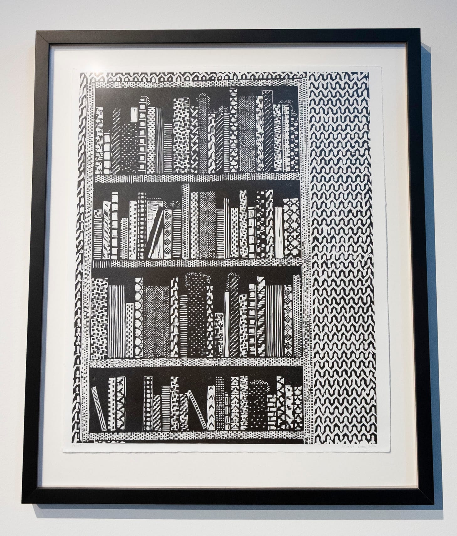 “The constraints the program imposes: the limited tool menu, the pattern palettes, and the flat, two-dimensional space,” he said, allowed him to create shapes, lines, and patterns for the carvings in his woodblock. Each art piece on display incorporates abstract shapes and patterns. The patterns are used to fill the spaces within the illustration.