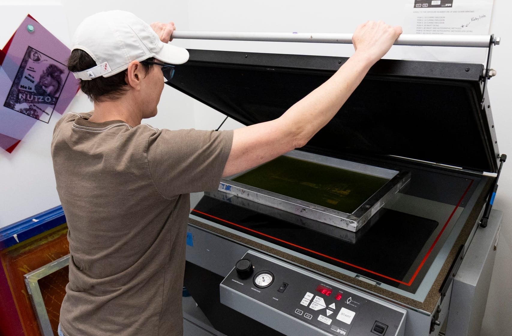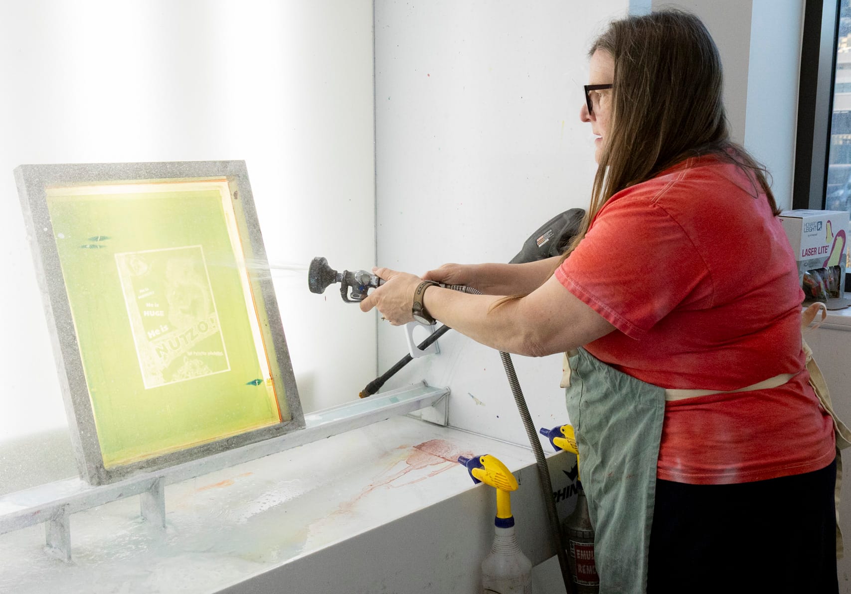 (L-R) Belinda Hahn is using a screen printing machine to print their image onto a stencil. Janice Tauscher washes her screen printing stencil. March 20, 2026. (Alejandra Cardenas/ The Guardsman)