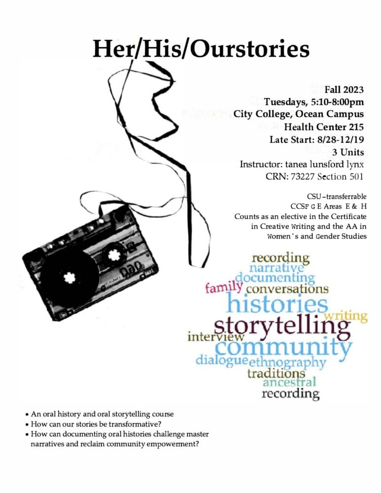 Her/His/Ourstories, WGST 20, is being revived from a several year hiatus this Fall 2023 semester. The “Oral History and Oral Storytelling” class will be taught by Women’s and Gender Studies Professor tanea lunsford lynx. The 3-unit course is Tuesdays, 5:10-8:00 p.m. on Ocean Campus in Health Center 215.