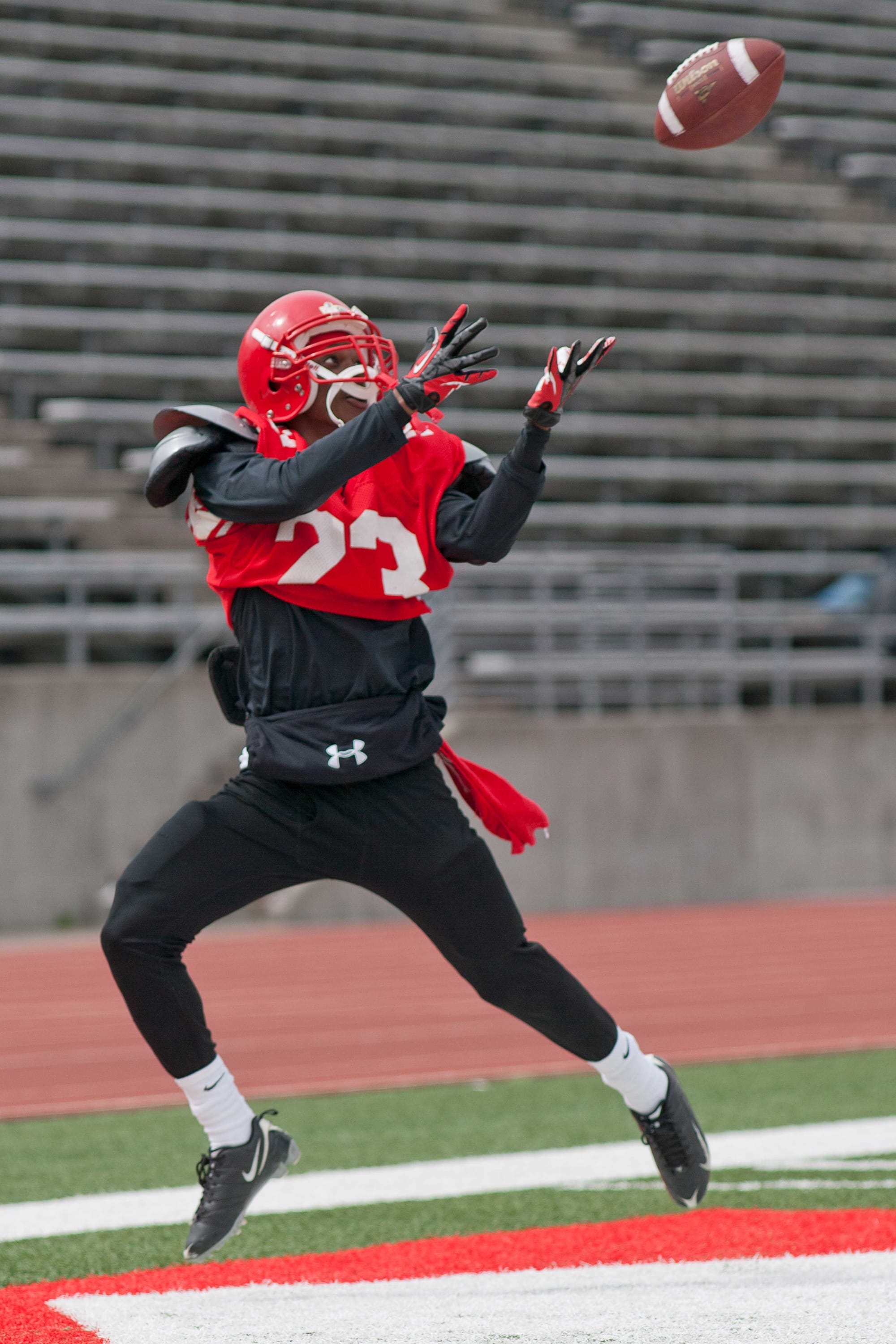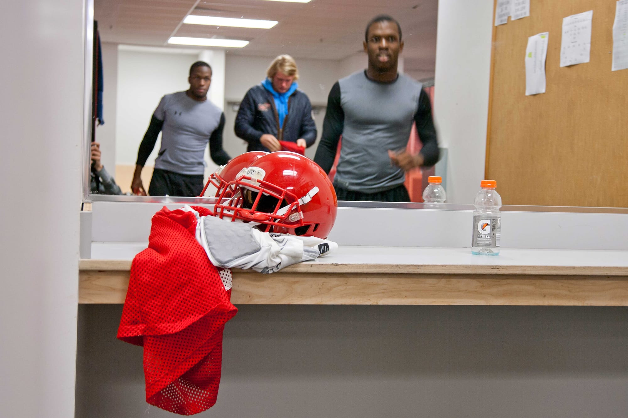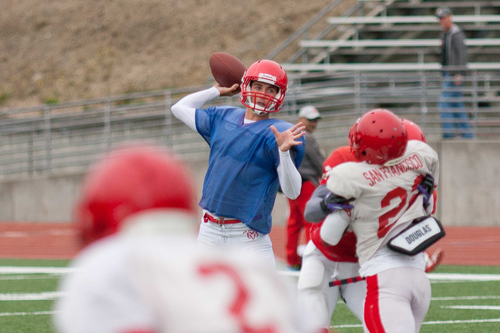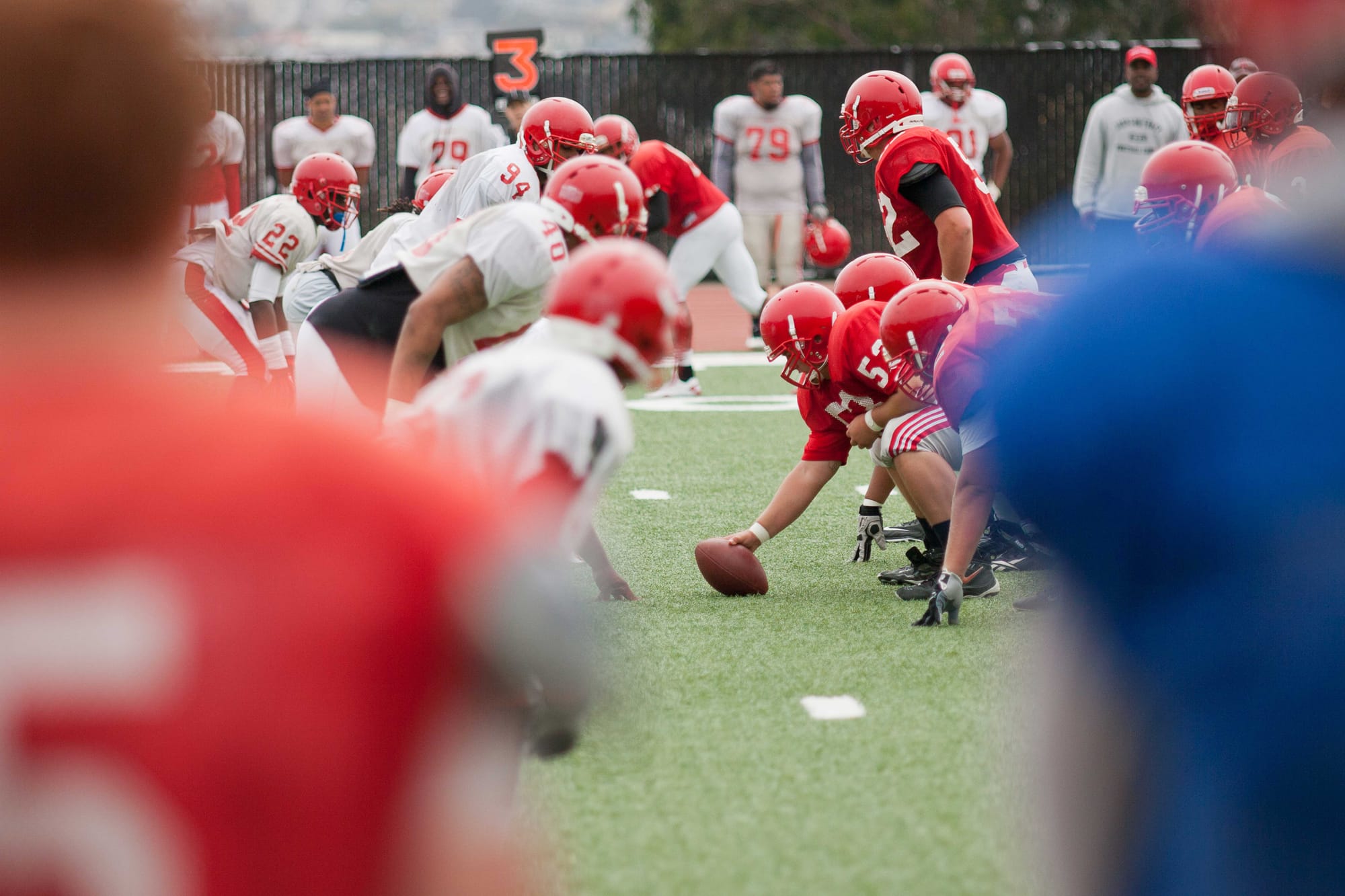 City College's football team has been preparing for the start of their season with rigorous yet necessary practices under the direction of Head Coach George Rush. The Rams held an early morning practice scrimage on Aug. 18, 2012 at Ocean campus. Their claimed their 9th National Champions title last year. "(This year) we have an outstanding freshman class, and there are quite a few returning players," Rush said. "The guys have a lot of confidence, and we have great team speed." The Rams will begin their season on September 1 with a home game against Diablo Valley College at 1 p.m. Photo by James Fanucchi/The GuardsmanDeandre Thompson, a freshman receiver for the RAMS, leaps to successfully complete a pass at practice on Aug. 15, 2012. Photo by James Fanucchi/The GuardsmanSophmore quarterback Andrew Spivey scans for an open receiver during a midfield play at City College's RAM Stadium during a Saturday morning scrimmage on Aug. 18, 2012. Photo by James Fanucchi/The GuardsmanFreshman Jeremiah Stuckey, defensive tackle, leaves the Wellness Center locker rooms Saturday afternoon to join his teammates back on the Ocean campus football field following a scrimmage played earlier that morning on Aug. 18, 2012. The practice was a double session with the scrimmage at 9 a.m., a comprehensive taped video review of the scrimmage at 12:30 p.m. and concluded with a routine practice which ended at 3:30 p.m. Photo by James Fanucchi/The GuardsmanAthletic Trainer Jose Bonilla, right, examines the ankle of defensive end Chris Martin, left, as a precautionary measure when Martin's ankle began hurting during a Saturday morning practice scrimmage on Aug. 18, 2012. "If you're hurt, you can still go, but if you're injured, you're out", Martin explained. "It's like one of those situations where it just hurts so bad you have to make it funny", he added. Photo by James Fanucchi/The GuardsmanMembers of the Rams grab their gear in the locker room and head out tot he football field for practice on Aug. 15, 2012. Photo by James Fanucchi/The GuardsmanThe Rams scrimage against each other at City College's Ocean campus football field on Aug. 18, 2012 prior to the start of the new season. Photo by James Fanucchi/The GuardsmanRams members stay hydrated and keep cool during practice. Photo by James Fanucchi/The GuardsmanRams members stay hydrated and keep cool during practice. Photo by Clarivel Fong/The Guardsman