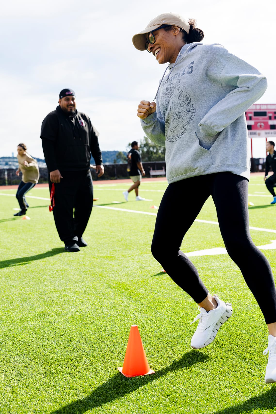 After a week of harsh rain, the sun had appeared. The new Flag Football class was finally able to gather at the George Rush stadium field again. “Get On Up” by James Brown blares across the field as students begin to line up for warm-ups and drills under the tutelage of Coach Socrates Vergara Jr.