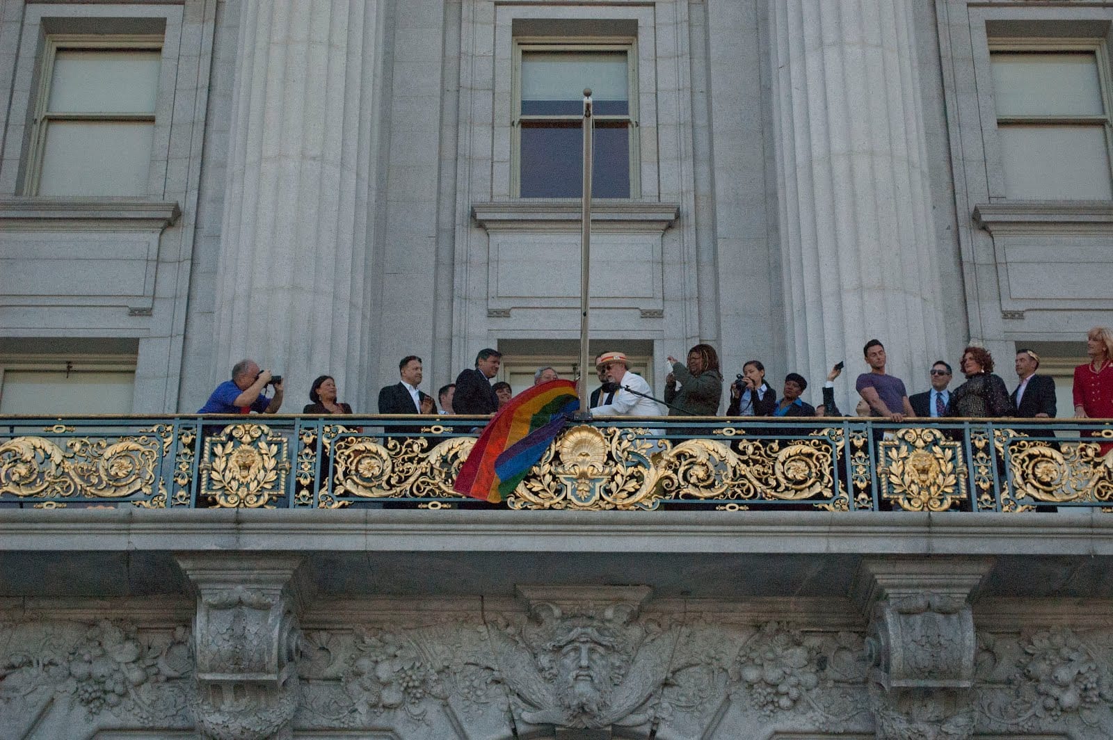 After the flag raising, everyone filtered inside City Hall to the second floor balcony overlooking the grand staircase and a statue of Harvey Milk, where the event continued with speeches and awards, followed snacks, champagne and mingling.