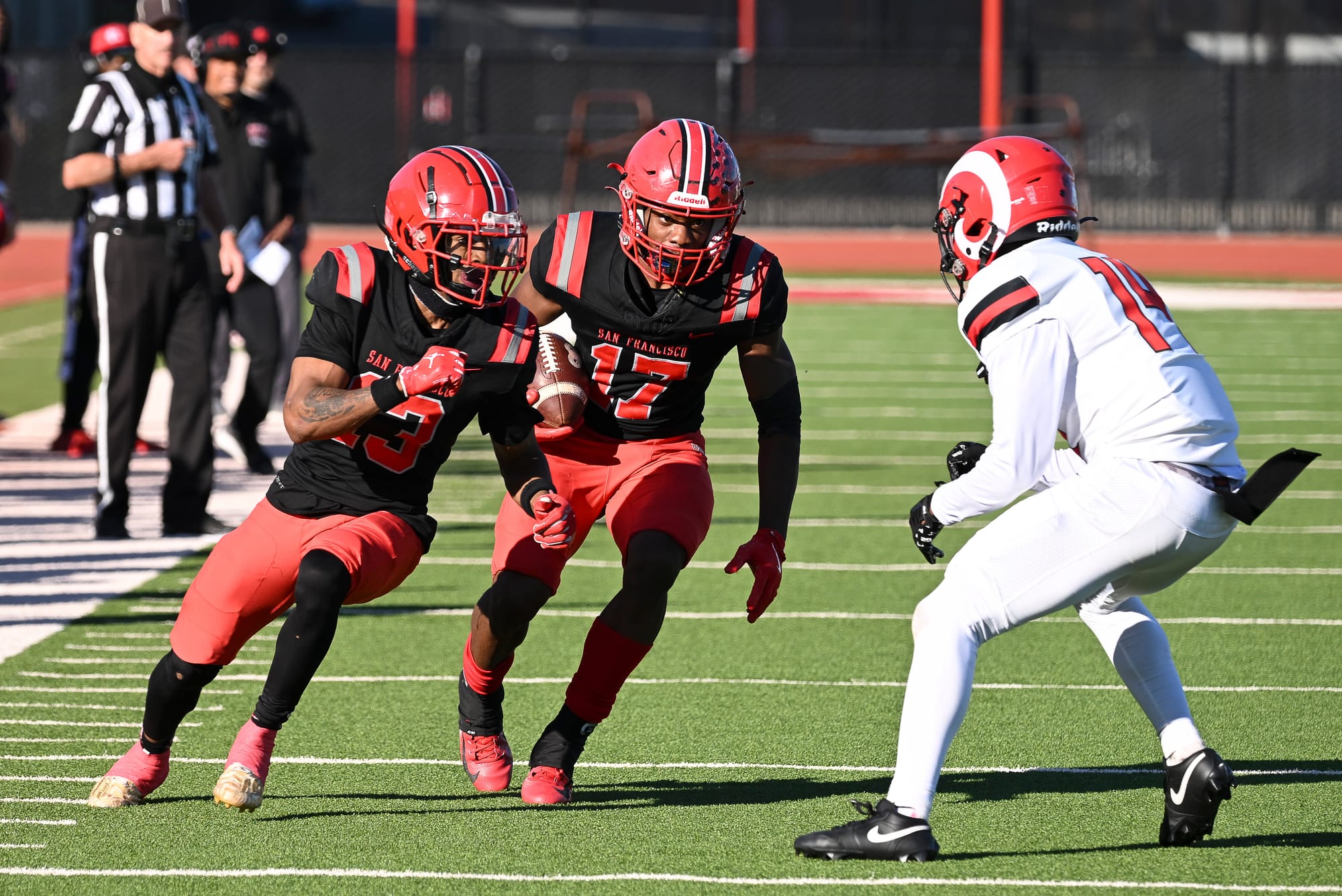 Rams WR Imari Conley (17) gains yards after a catch with WR Zakarri Black (13) as a blocker leading the way during the playoffs against Fresno City College in San Francisco, on Saturday, Nov. 11, 2025. (Bob Kinoshita/The Guardsman)