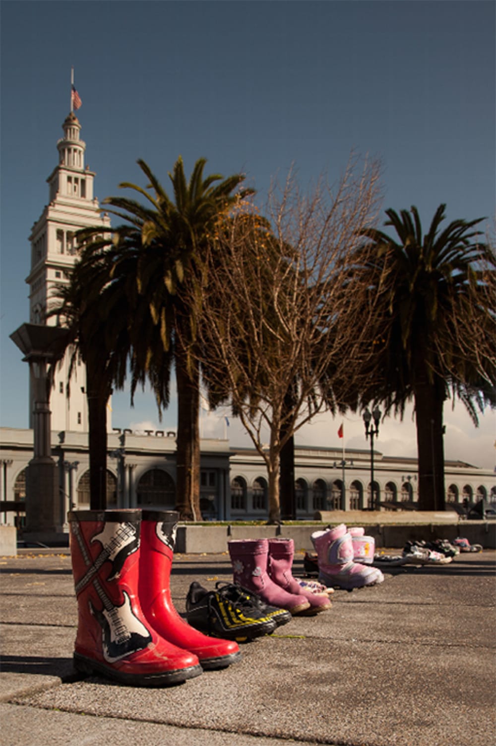 20 pairs of small rain boots and shoes lined the stage at Justin Herman Plaza on Dec. 22 in tribute to the children who were murdered eight days earlier at Sandy Hook Elementary School in Newtown, Conn.
