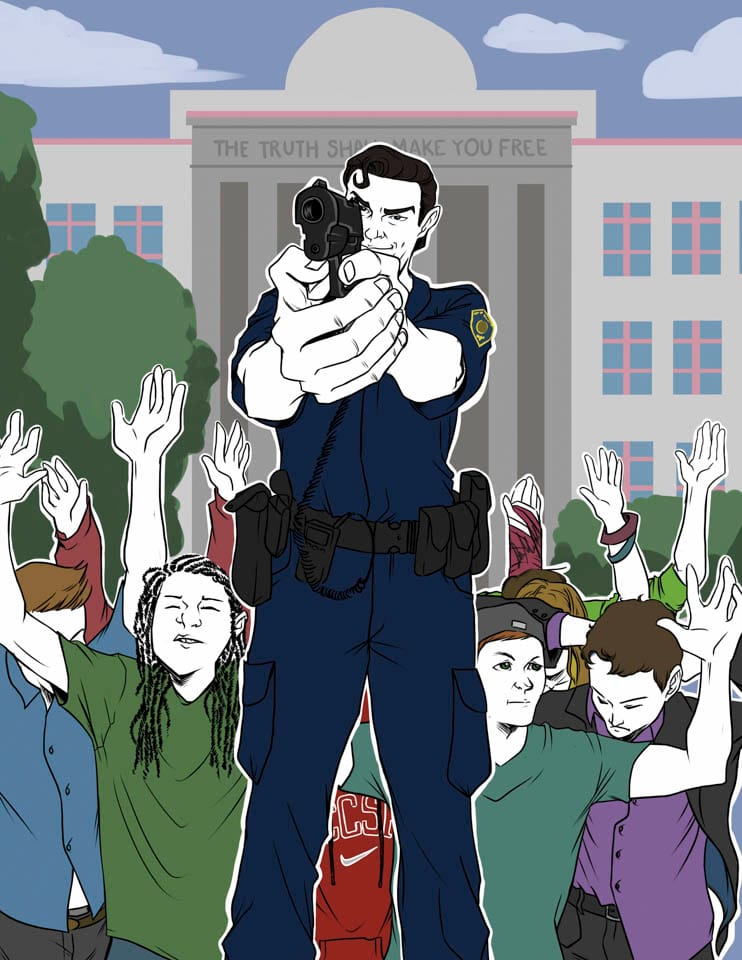 Officer brandishes his gun around students. (Illustration by Serina Mercado)