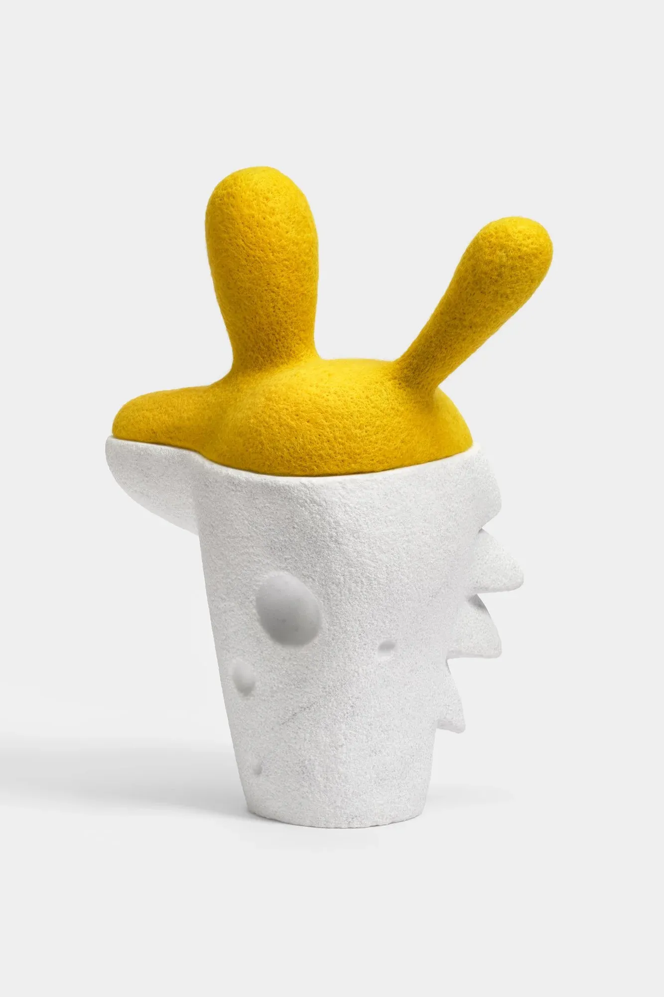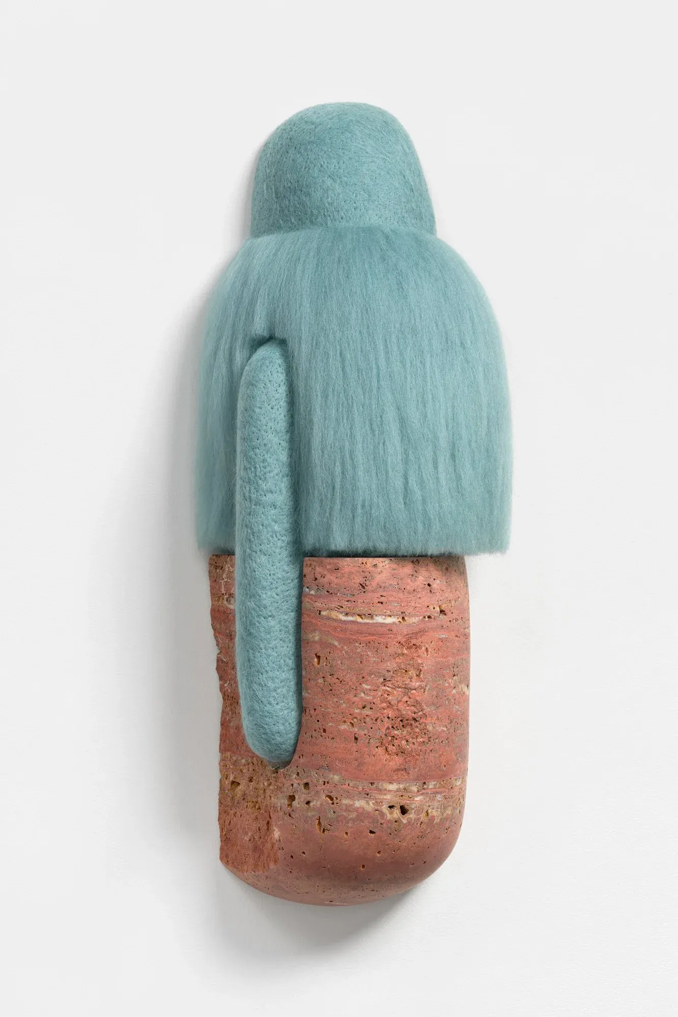 Stephanie Robison’s sculptures juxtapose the smooth, hand-refined surface of stone with the soft fuzziness of wool. The works range from small, palm-sized objects to larger wall-mounted pieces, each exploring the tension between hardness and warmth in her new solo exhibition.