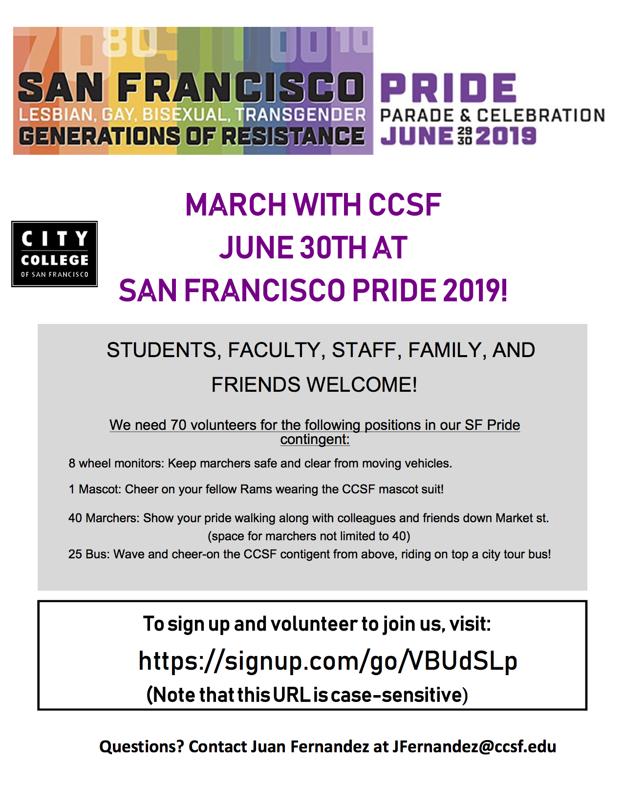Be part of the PRIDE parade representing City College of San Francisco on June 30, 2019!