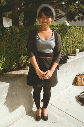 Her favorite places to shop are Urban Outfitters and second hand stores on Haight Street. Some pieces of her ensembles — from her hat to her to her skirt — are from stores like H&M, Goodwill, and Buffalo Exchange.