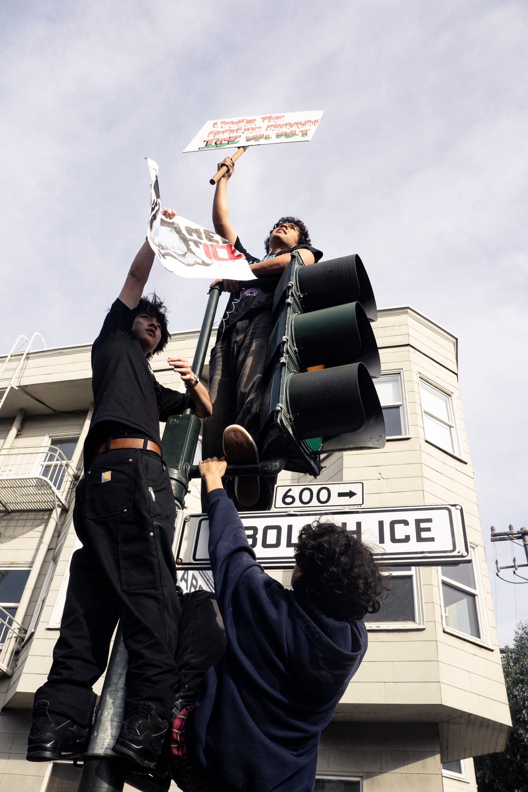 Others hung from a light post at Dolores and 19th St., where the street signs had been replaced with “Abolish ICE” placards. A group of grade schoolers chanted, “The only ICE we like is ice cream.”