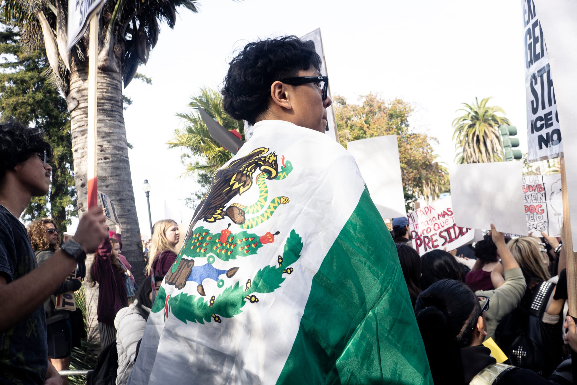 Students from dozens of Bay Area schools coordinated their own walk-outs and joined in the protest. Many still wearing backpacks, they carried signs reading “Hot People Melt ICE,” “No one is illegal on stolen land,” and “We like our ice CRUSHED.”