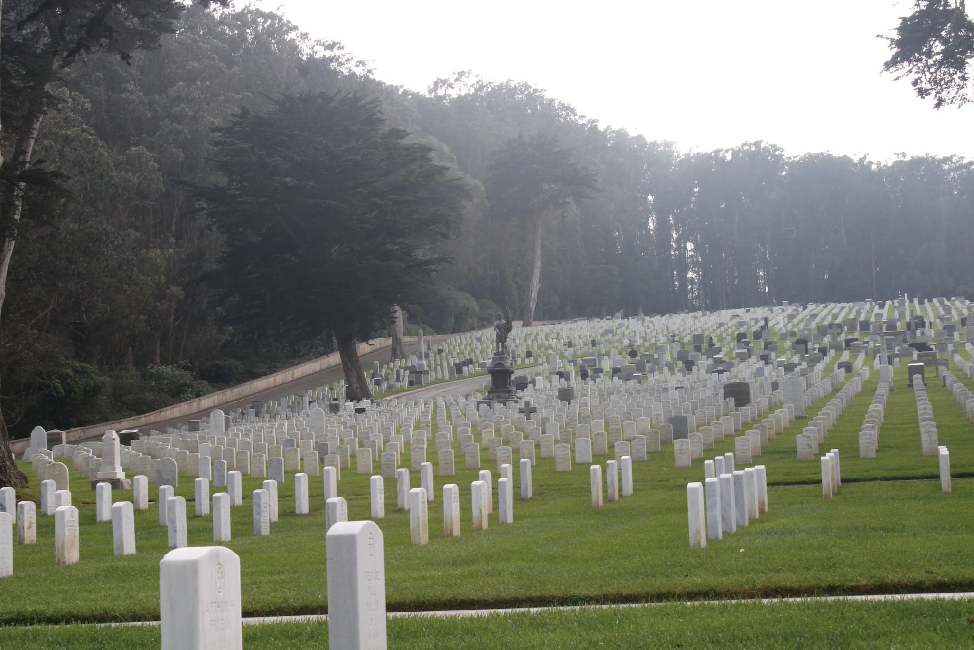 Across the city, memory takes a different shape. The San Francisco National Cemetery, at the northern edge of the Presidio, slopes toward the bay in precise rows of stones.